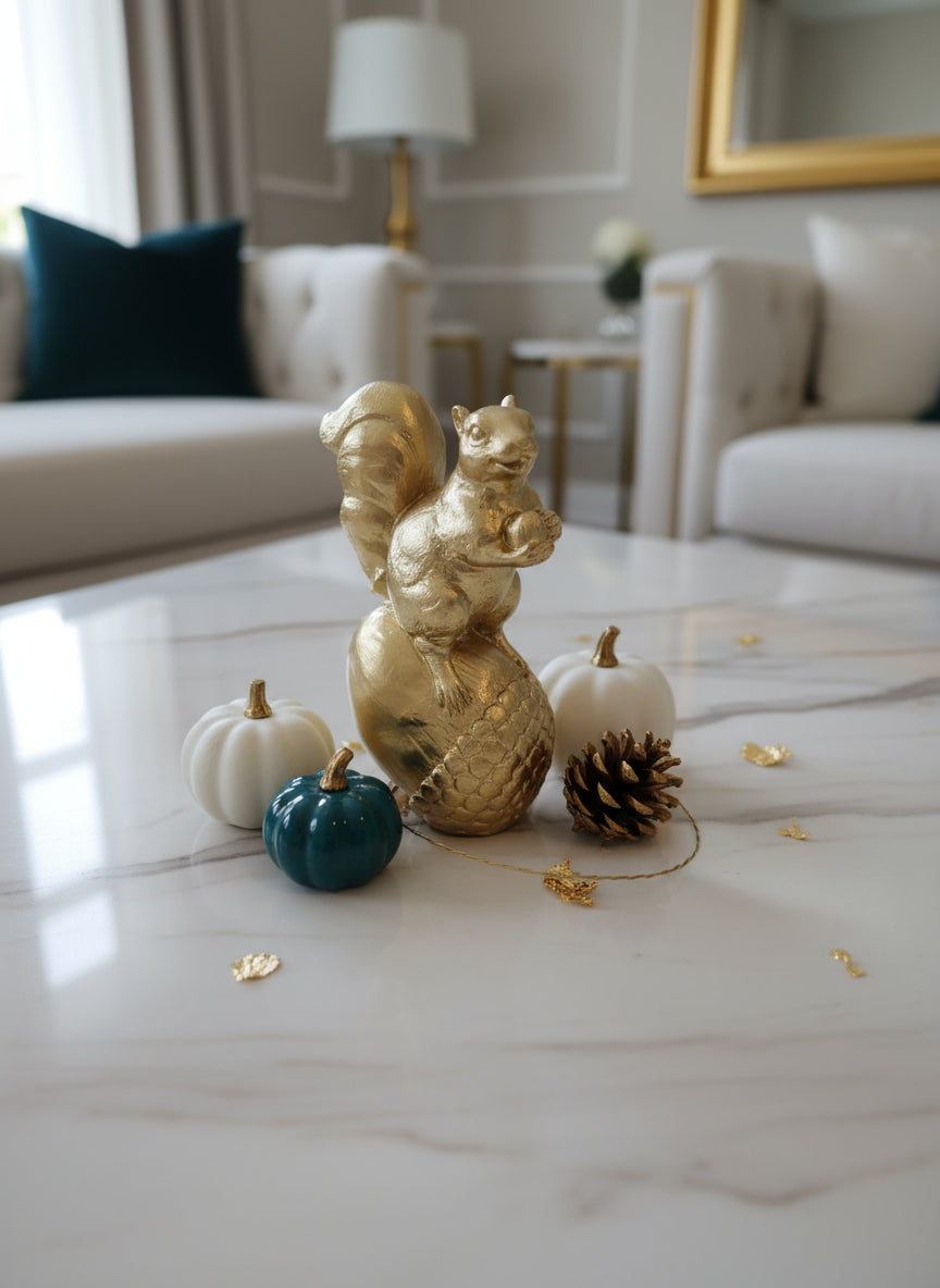 Meticulously handcrafted from solid concrete, this charming squirrel sculpture features a fluffy squirrel sitting on an acorn while holding a solid gold acorn. Built to last, it is 100% waterproof and UV resistant, making it ideal for both indoor and outdoor fall décor. This timeless piece effortlessly enhances seasonal settings with refined elegance and enduring quality.